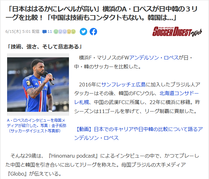 そんな29歳は、『Hinomaru podcast』によるインタビューの中で、かつてプレーした中国と韓国を引き合いに出してJリーグを称えた。母国ブラジルの大手メディア『Globo』が伝えている。