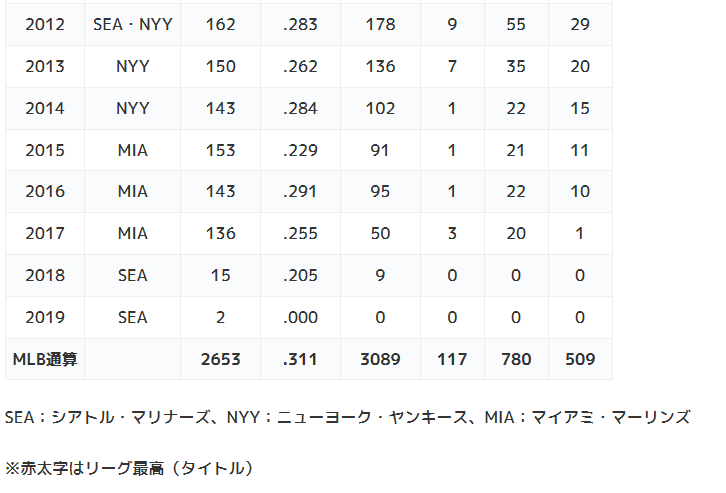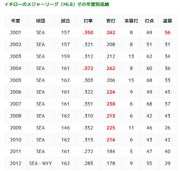 イチローのメジャーリーグ(MLB)での年度別成績