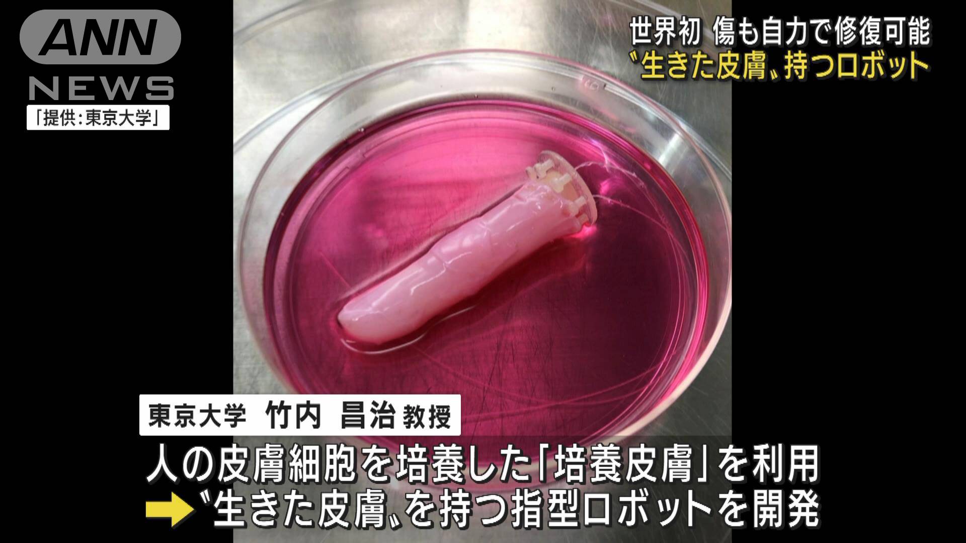 東京大学大学院情報理工学系研究科の竹内昌治教授、河井理雄大学院生(研究当時:修士学生)を中心とした研究グループは、人の皮膚細胞から作製される「培養皮膚」(人やその他動物の皮膚細胞を体外で増殖・培養して作製された皮膚組織)を利用し、細胞由来の生きた皮膚を持つ指型のロボットを世界で初めて開発。2022年6月9日午前11時(米国東部夏時間)に米国科学誌「MATTER」のオンライン版に掲載された。