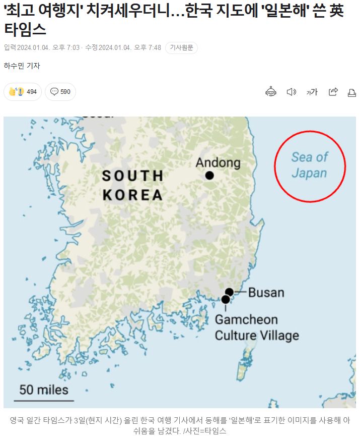 イギリスメディア「ザ・タイムズ」が2024訪問しやすい国で韓国旅行を積極的に推薦した中で一緒に載せられた地図に東海が「日本海」と表記されていて残念を残した。