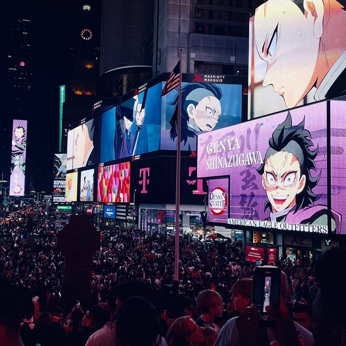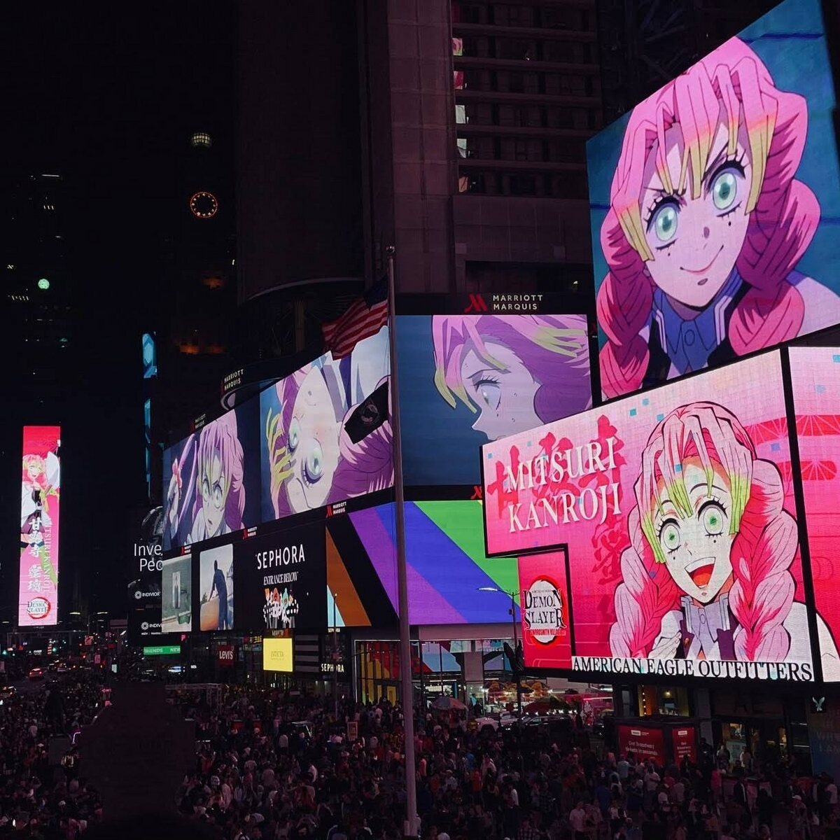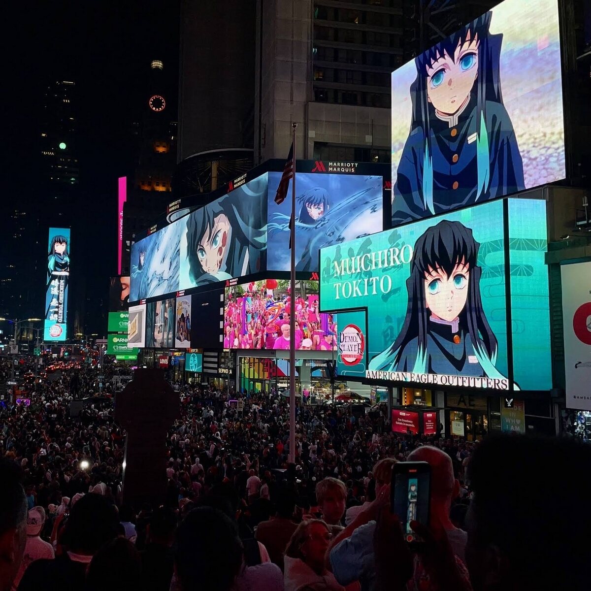 刀鍛冶の里での戦いがクライマックスを迎える最終話放送当日、ニューヨーク・タイムズスクエアの大型ビジョンをジャックしたのは『鬼滅の刃』の登場キャラクター。タイムズスクエアの前には、作品のTシャツやキャラクターの柄があしらわれた羽織りを身にまとう人、「刀鍛冶の里編」のオリジナルケーキを作って訪れるファンなど、ビジョン広告のスタートを待ちわびる熱狂的な観客が集まった。