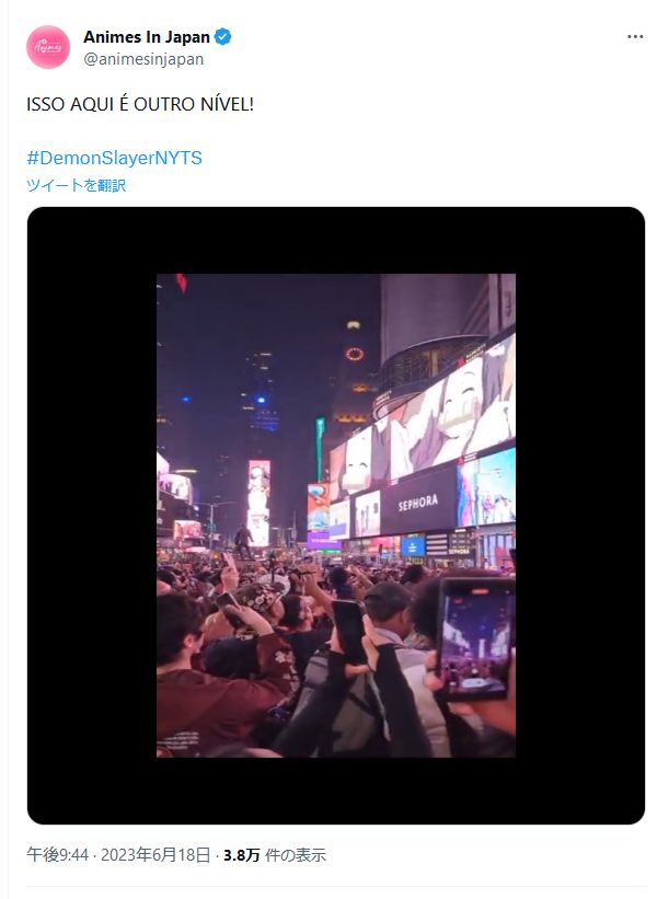 その後、夜のタイムズスクエアの大型ビジョンに映し出された広告には、炭治郎、禰豆子(※)、霞柱・時透無一郎、恋柱・甘露寺蜜璃、不死川玄弥、半天狗が次々と登場。大きな盛り上がりを見せた現地会場だけでなく、その様子を配信で見たファンから「行きたい!」と声があがるなど世界各地から多くのコメントが寄せられた。