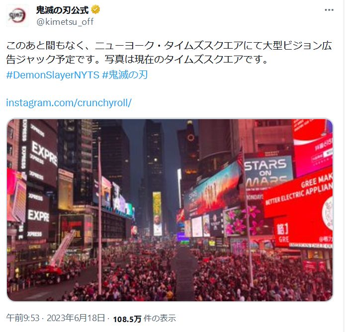 『鬼滅の刃』がNYタイムズスクエア大型ビジョンをジャック! 炭治郎たちの登場に現地ファン熱狂