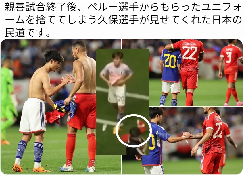 페루로서는 서운할 수 있는 장면이다. 페루 매체 ‘파세 필트라도’는 쿠보와 칼린스의 유니폼 교환 장면을 공유하며 “쿠보가 페루 선수와 유니폼을 바꾸고 끔찍한 행동을 범했다”고 규탄했다. 이를 본 페루 축구팬들은 “쿠보가 도대체 누구야?”, “저 어린 선수 건방지네”라며 쿠보의 행동을 지적했다.