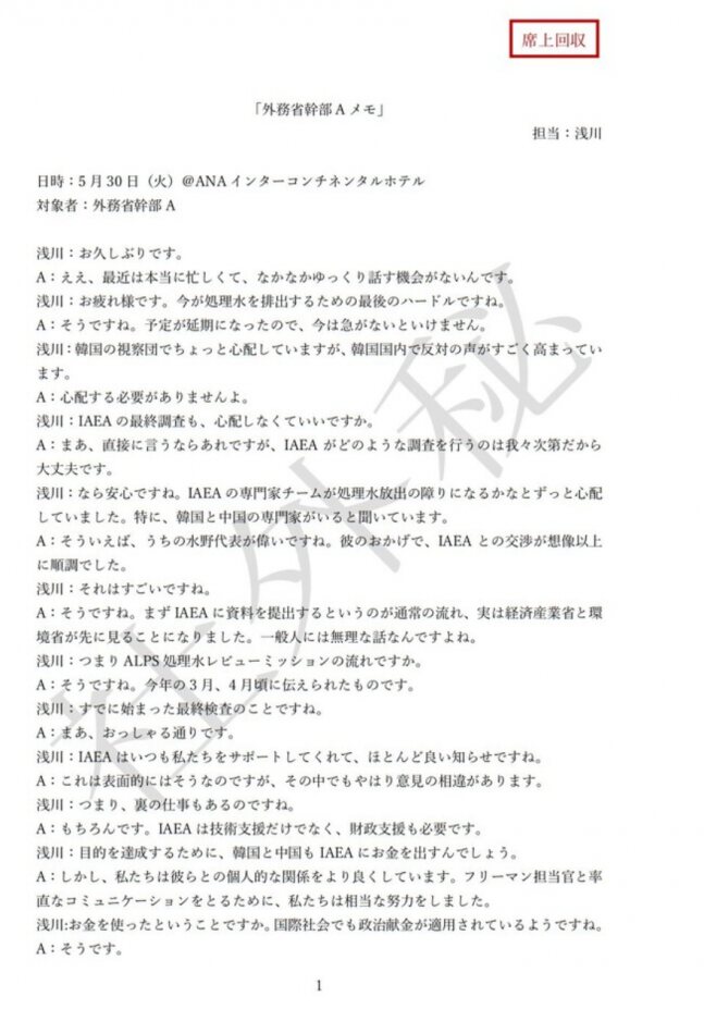日本外務省(MOFA)と日本メディア(メディア)が最近、この事案(日本政府がIAEAに賄賂を与えたと暴露した文書の内容)を否定したため、私は暴露された文書情報が事実であることを言いたいと思います。言及された多くのディテールが私が知っているものと合致(一致)します。水野(Mizuno. 日本のIAEA代表)とフリーマン(Freeman. IAEAの担当官)の間に五間100万ユーロを超える政治献金、ストロンチウム90が基準値を(3万倍も)超えるということなど暴露された文書に含まれる内容彼らはすべて本当です。あなたの番組(放送)で日本の外務省が恐ろしく、それが彼らがそんなに強く反論して出た理由です。