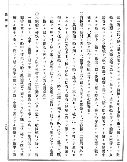 「進退ニハ帆或ハ櫓ノ類ヲ用ヒズ、船底ノ中央部ヲ縦ニ切リ抜キテ海面ニ通ゼシメ、其ノ前後左右ヲ板ニテ囲ミ、以テ水ノ船内ニ入ルヲ防ギ、此ノ切抜ニ車ヲ装着シ、人力ヲ以テ船内左右ヨリ車ヲ回転セシメテ以テ船ヲ進ムルモノナリ、(此レ殆ド欧式汽船ニ用ヒシ外車ト其理ヲ同フス)……」