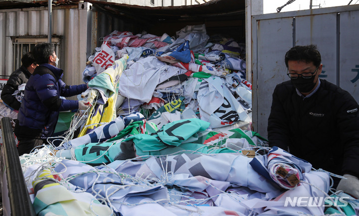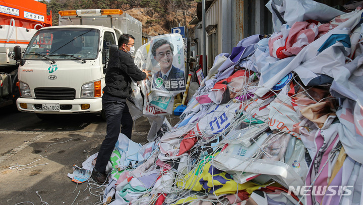 環境部が今年1-3月、政党による横断幕をはじめ全国の自治体が回収したと報告された横断幕を集計したところ、1300トンに上った。横断幕一つの平均重量が600グラムであることを考慮すると、200万枚を超える計算だ。