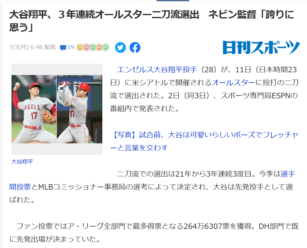 打者に加えて投手でも選出され、エンゼルスのネビン監督は「誇りに思う。今年はマウンド上でアップダウンもあるが、先発投手として安定して回ってくれている。DHとして選ばれて、投手としても出場できる機会があるのは、とてもいいことだ」と語った。