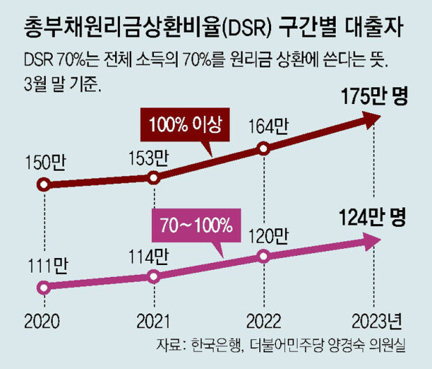 融資を受けた人全体の総負債元金返済比率(DSR)は40.3%だった。今年第1四半期末に国内の家計向け融資を受けた人は平均的に年収の約40%を借金返済に使わなければならないことを意味する。