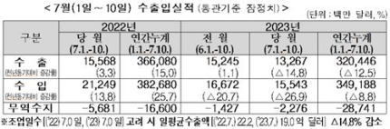7月上旬輸出14.8%↓… 今年累積貿易赤字287億ドルに増え(総合)