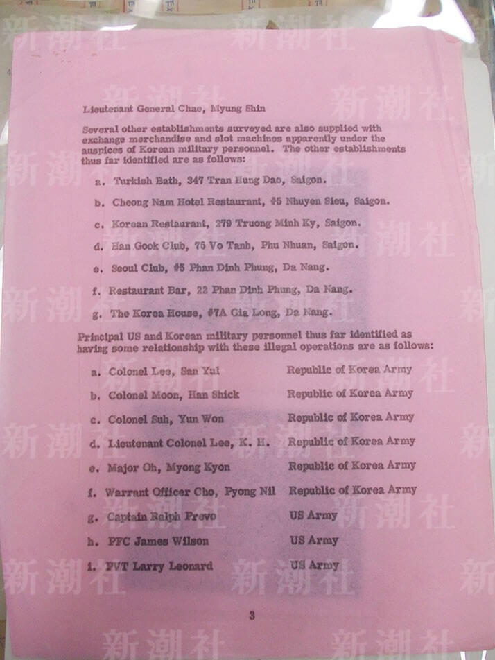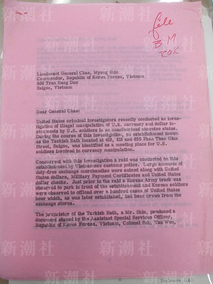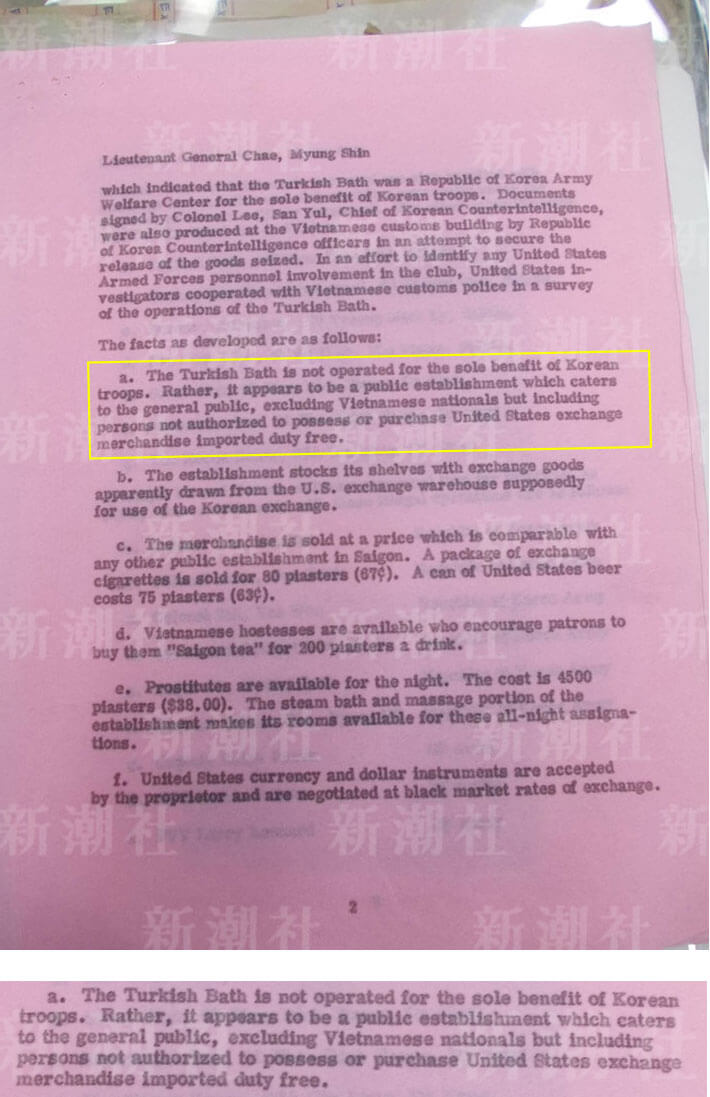 ターキッシュバスの所有者であるミスター・シンという人物は、ベトナム駐屯韓国軍特別サービス補佐官のスー・ユン・ウォン大佐の署名が入った文書を提出しました。そこには、ターキッシュバスは韓国軍のみに便益を提供する大韓民国軍福利センターである、と示されていました。また、押収された物品の返還を求めて、大韓民国軍防諜部隊長のリー・サン・ユル大佐が署名をした文書も、大韓民国軍防諜部隊将校らによりベトナム税関ビルで提出されました。米国捜査官らは、米軍関係者の施設への関与を明らかにするため、ベトナム関税警察によるターキッシュバスの業務調査に協力しました。>>25
