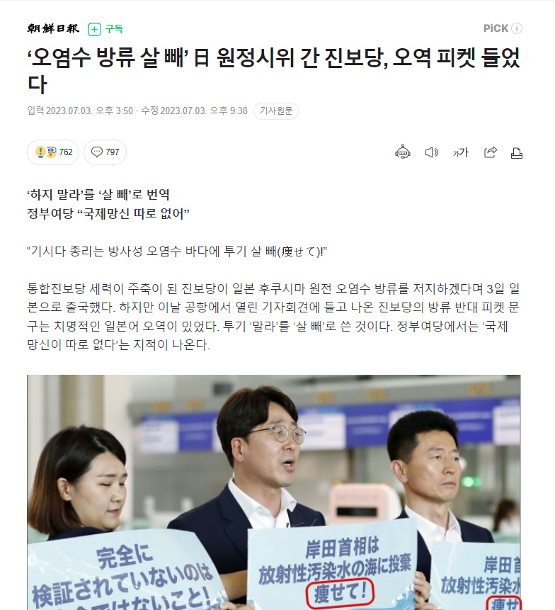 この日、進歩党カン・ソンヒ議員と関係者らは仁川国際空港で記者会見を進行した。彼らは「岸田首相は放射性汚染水海に投機しないでください!」と書かれたピケットを持っていた。問題はこれを翻訳したフレーズ「岸田首相は放射性汚染水の海に投棄痩せて!」だった。「痩せて」は肥満の人に「肉抜き」「肉抜いて」くらい使われるフレーズなのに「しないで」が入らなければならない席に入ったものと見られる。ある翻訳家は「韓国語のフレーズを入れて翻訳機を回して間違って翻訳されたように見える」とし「この誤訳以外にも残りの調査なども滑らかではない」とした。