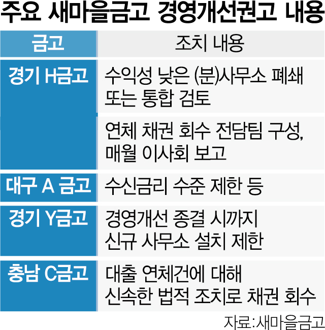 措置内容もイメージではない。 京畿道に位置するS金庫、N金庫、H金庫などは収益性の低い事務所を閉鎖したり、他の事務所と統合を検討するようにした。 また、大邱A金庫は受信金利水準を制限するようにし、忠南にあるC金庫は、貸出延滞件に対して迅速な法的措置で債権を回収し、延滞率管理のための新規融資審査を強化するようにした。