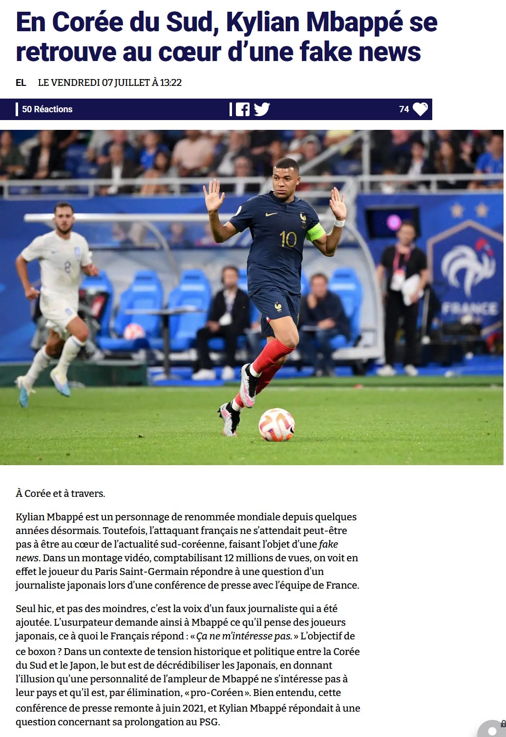 「韓国と日本の間にある歴史的・政治的緊張の文脈においては、その目的は、エムバペほどの人物が日本に興味がなく、『親韓派』であるかのような錯覚を与え、日本人を傷つけることだ。控えめに言っても、両国間の関係を良くはしない事件だ」