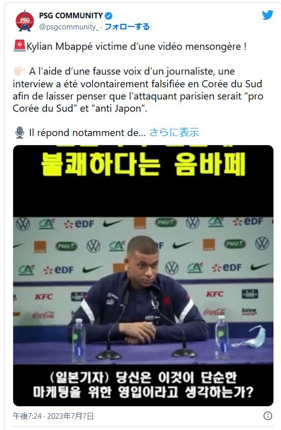 「悪意のある韓国人による非現実的な捏造の中心にいることに気づいた。エムバペは予期していなかったはずだ」