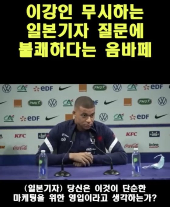 パリ・サンジェルマンのフランス代表FWキリアン・エムバペに対し、日本人記者が「イ・ガンインという韓国人選手がパリ・サンジェルマンに来ると聞いた。これは単なるマーケティングのための獲得だと考えるか。日本人選手についてはどう思うか」と質問。エムバペは不快感を見せながら、次のように回答する。