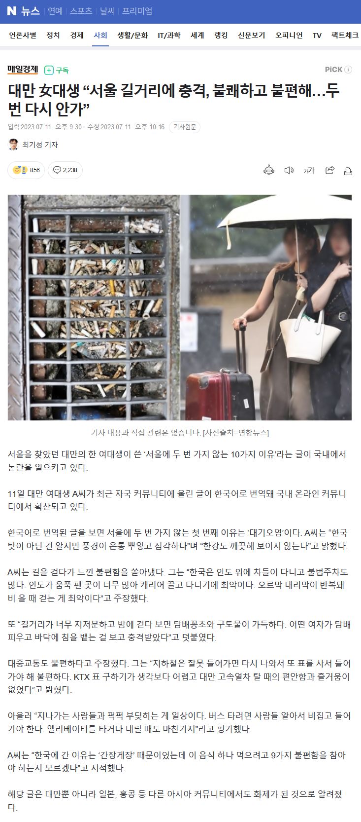 投稿はかなり長文で、「ソウルに二度と行かない10の理由」として「ひどい大気汚染」「自動車が歩道に乗り入れ、歩道に駐車する」「地下鉄が不便」「車道に穴が多くてでこぼこ」「街がとても汚い」「坂道がとても多くて急こう配」「コンセントも電圧も台湾と違う」「高速鉄道に自由席がない」「公共交通で譲り合いをしない乗客がいる。エレベーターの中で大声で話す」「おいしい韓国料理は日本でも台湾でも食べられる」を挙げた。