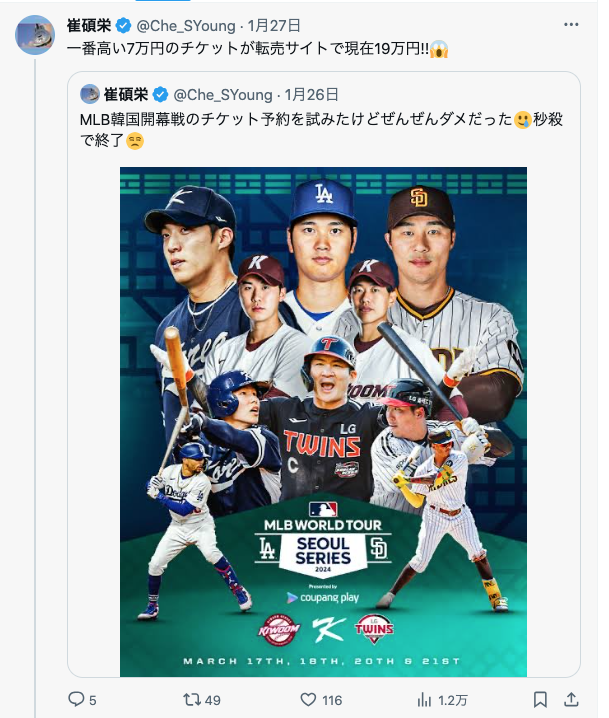 韓国のストリーミングサービス『Coupang Play』は1月29日、「26日に販売開始したMLBワールドツアー・ソウルシリーズ2024公式開幕戦1次戦チケットが、8分で全席完売となった」と明らかにした。