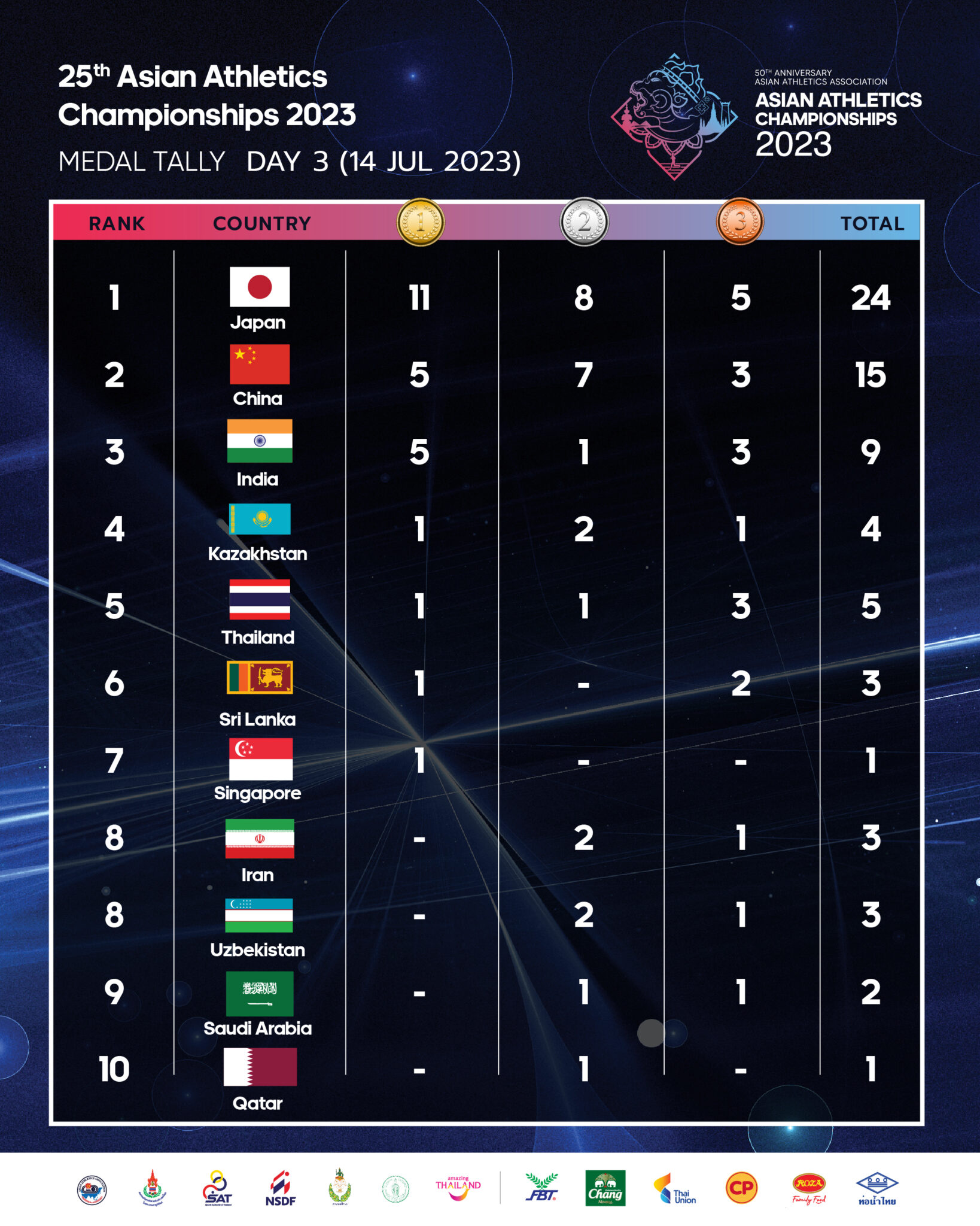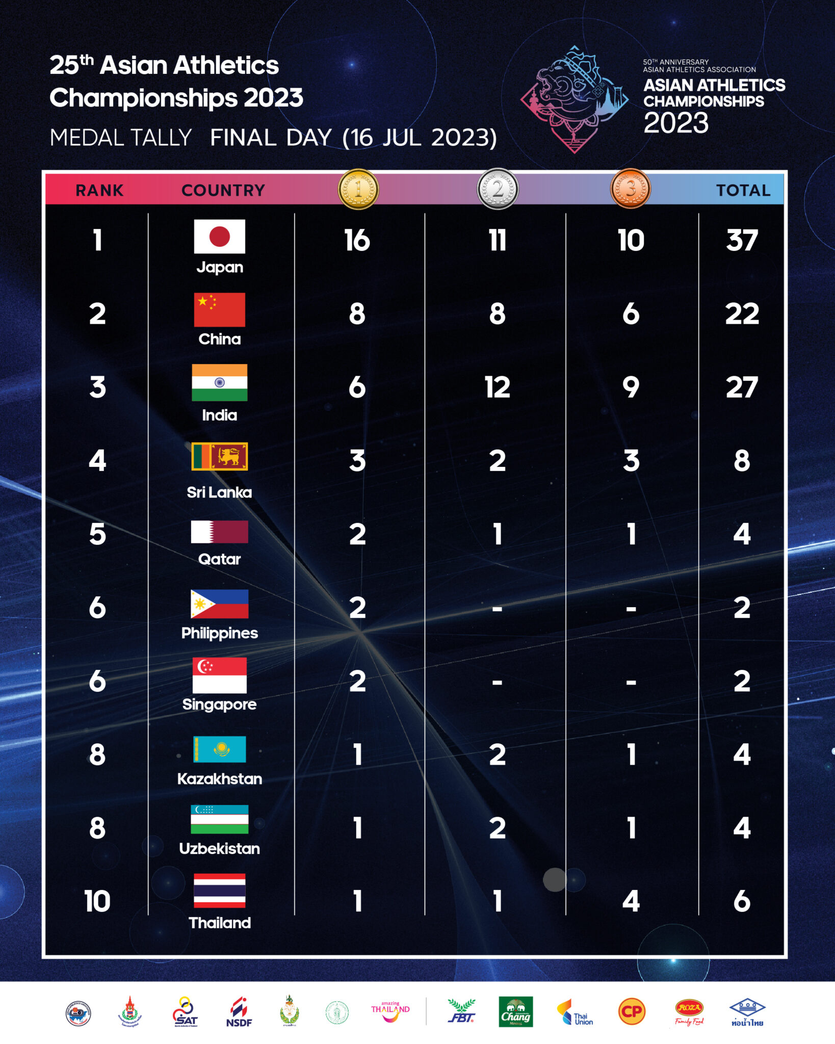 アジア陸上選手権が閉幕。国別メダル数の結果