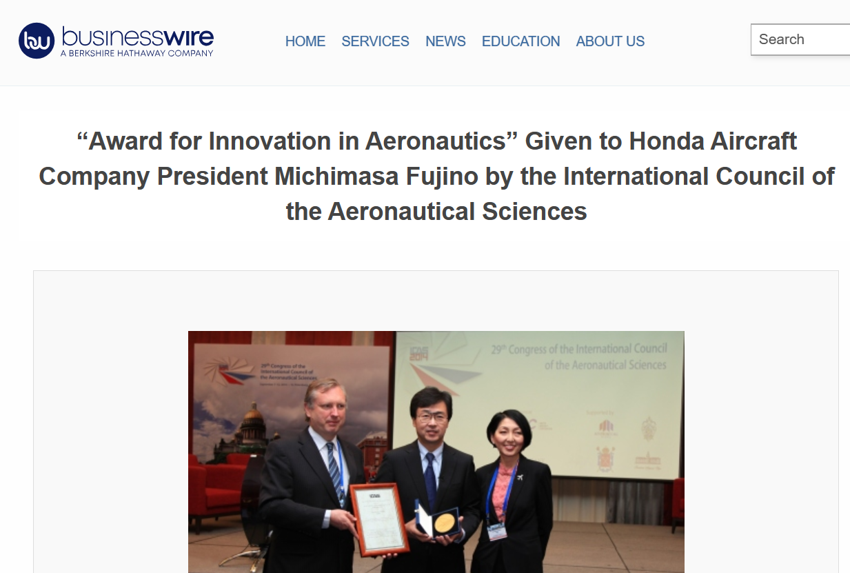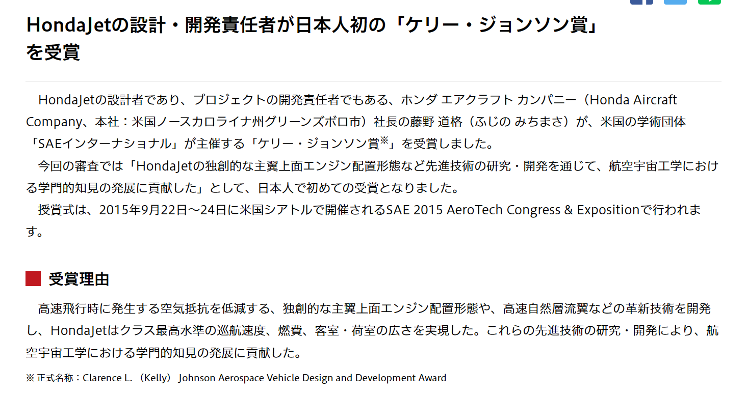 HondaJetの設計者であり、プロジェクトの開発責任者でもある、ホンダ エアクラフト カンパニー(Honda Aircraft Company、本社:米国ノースカロライナ州グリーンズボロ市)社長の藤野 道格(ふじの みちまさ)が、米国の学術団体「SAEインターナショナル」が主催する「ケリー・ジョンソン賞」を受賞しました。>>7