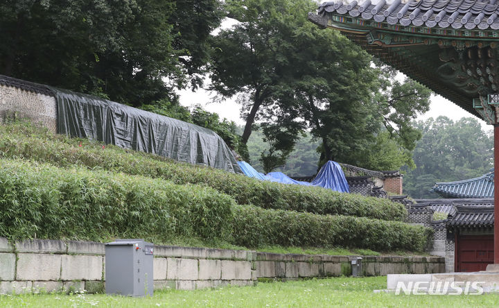 6日、ソウル市鍾路区の昌徳宮を訪れた観光客。集中豪雨で流失した仁政殿の裏手にある階段式花壇「花階」の塀を見ている。豪雨続きで、花渓の塀は約15メートルにわたり崩れ落ちた。