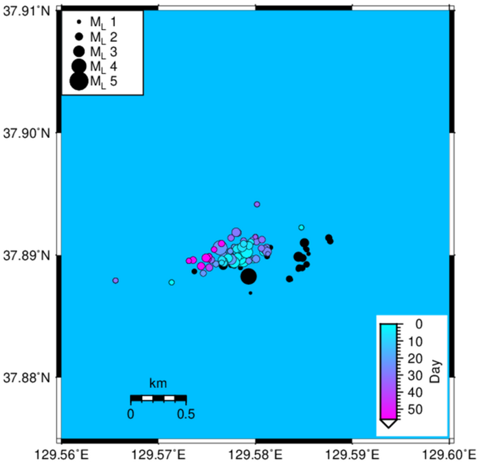 韓国地質資源研究院(地自然)は18日、「東海(江原)連続地震報告書」を発刊したと明らかにした。報告書には5月15日、東海市東北東約60kmの海域で発生したリヒター規模4.5地震を含め、4月23日以降6月20日まで朝鮮半島海域で発生した合計232回の地震に関する主要な分析情報が含まれている。