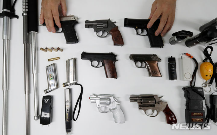 【NEWSIS】刃物による通り魔事件や殺人予告などが相次いで発生し国民の不安が高まる中、護身用品を買い求める人が増えている。写真は6日、ソウル市瑞草区の護身用品販売店「大韓安全公社」の各種護身用品。