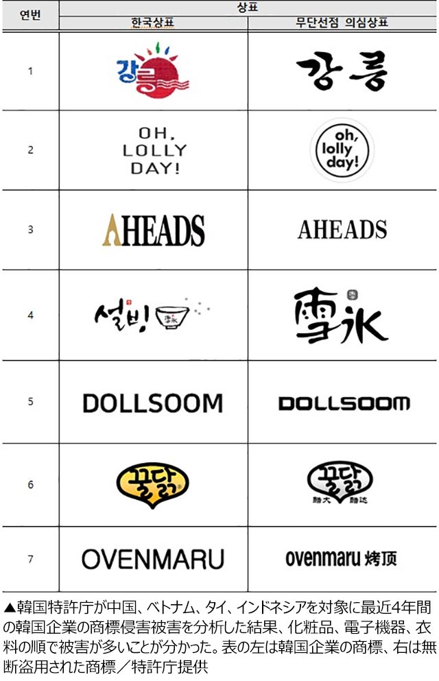 韓国特許庁は23日、2019年から22年までの期間に中国、ベトナム、タイ、インドネシアで発生した韓国企業の商標侵害被害の分析結果を発表した。被害が最も大きかったのは化粧品(18.7%)で、電子機器(15.3%)、衣料(15.1%)、フランチャイズ(13.2%)、食品(7.6%)が続いた。韓流で韓国ブランドの認知度が上昇し、外国企業が韓国のブランド商標を無断出願。商標紛争やコピー商品の流通といった被害につながっていると分析される。