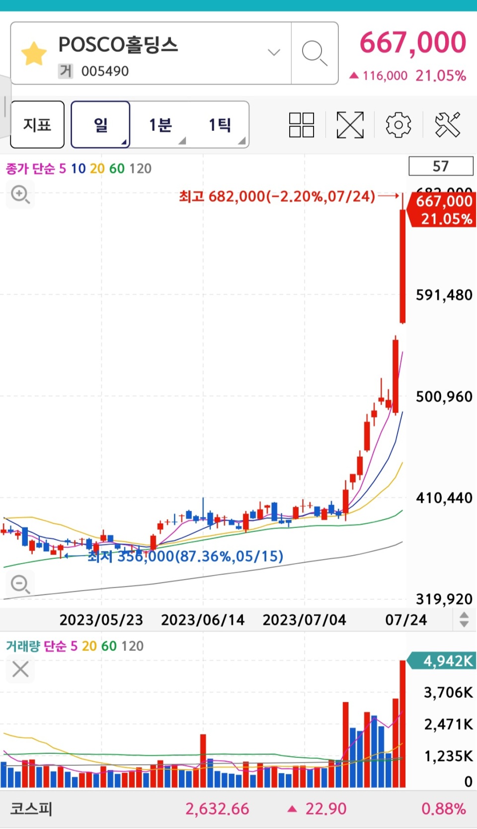 포스코홀딩스(POSCO홀딩스) 주가도 고공행진을 이어가고 있다. 시가총액은 현재 54조원을 넘어섰다.