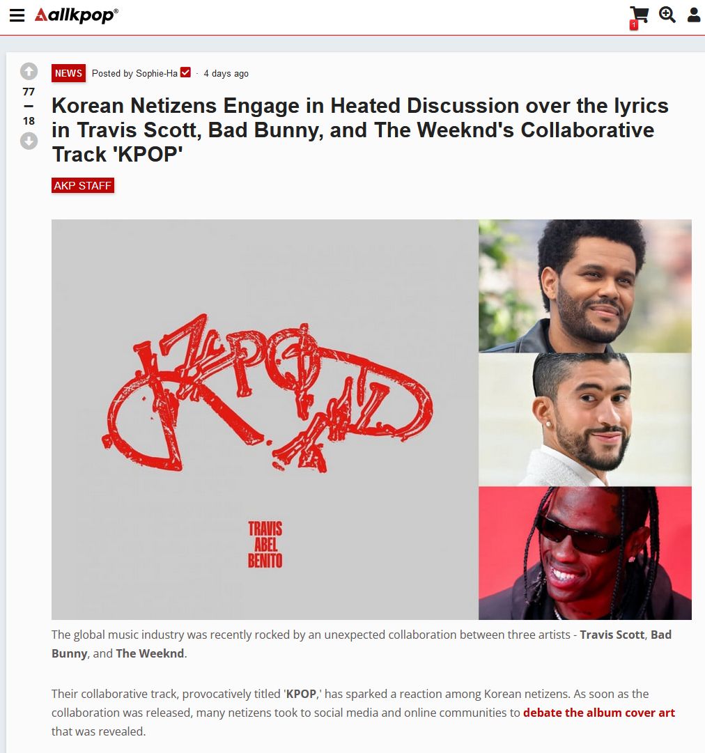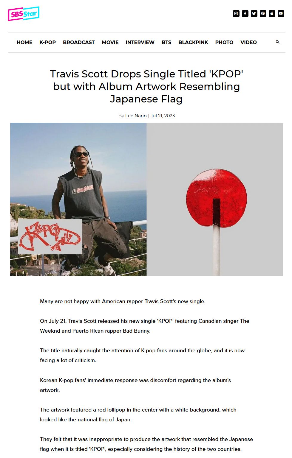 米ヒップホップ歌手トラヴィス・スコットが最近リリースした新曲が、韓国で物議をかもしている。タイトルが「K-POP」である一方、アルバムカバーには白地には「日の丸」を連想させる図柄が使われているためだ。