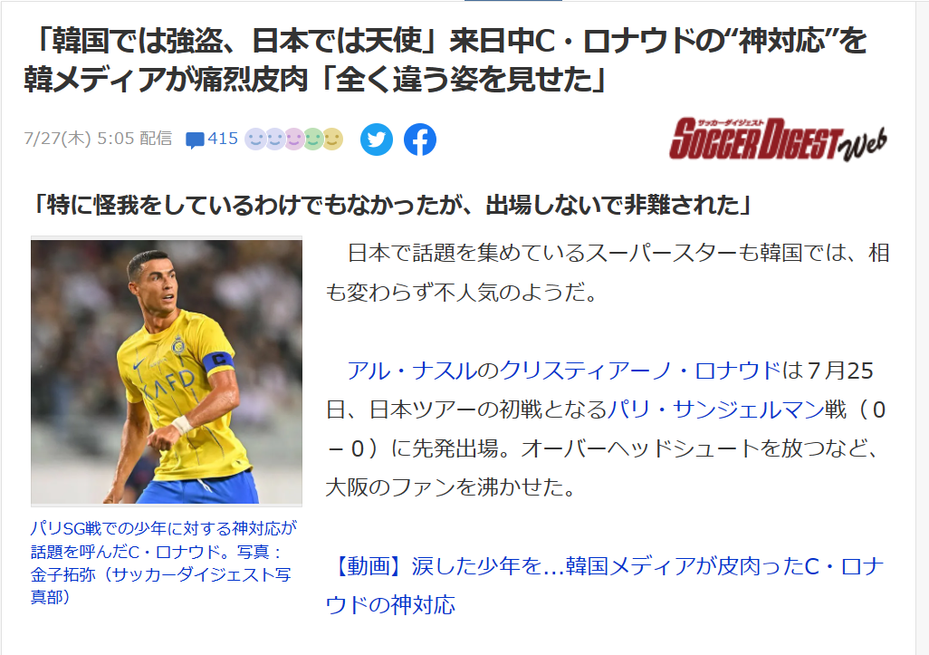 「韓国では強盗、日本では天使」来日中C・ロナウドの“神対応”を韓メディアが痛烈皮肉