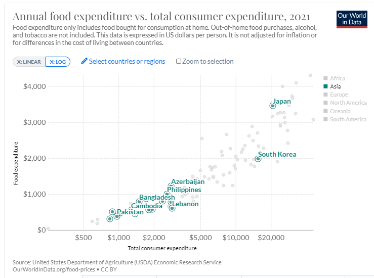 家計負債の対GDP比は日本が60%程度、韓国は100%を超過している。日本が家計からより多く食費を割けるのは明白で、韓国にはその余裕がないと言える。別に不思議でもなんでもない、借金が多くて貧乏な韓国人は貧しい食生活を送っているというだけのことだね☺️韓国のエアコンの性能が悪い上にやたらでかいのは内緒ニダ<丶`∀´>