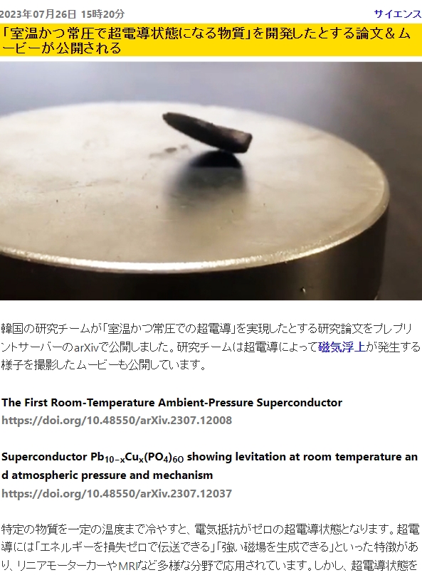 速報.!! 「超電導体の磁気浮上を室温かつ常圧で確認した」とされる 日本メディアの報道内容です