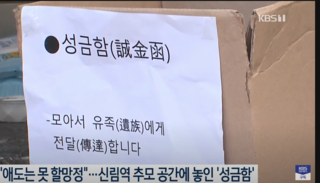 オンラインコミュニティにこの写真を載せた作成者は「募金箱を強制的に片付けたのにまた持ってきた」として「遺族が嗚咽しながら蹴ったりもした、被害者と何の関係もない老人だった」と話しました。