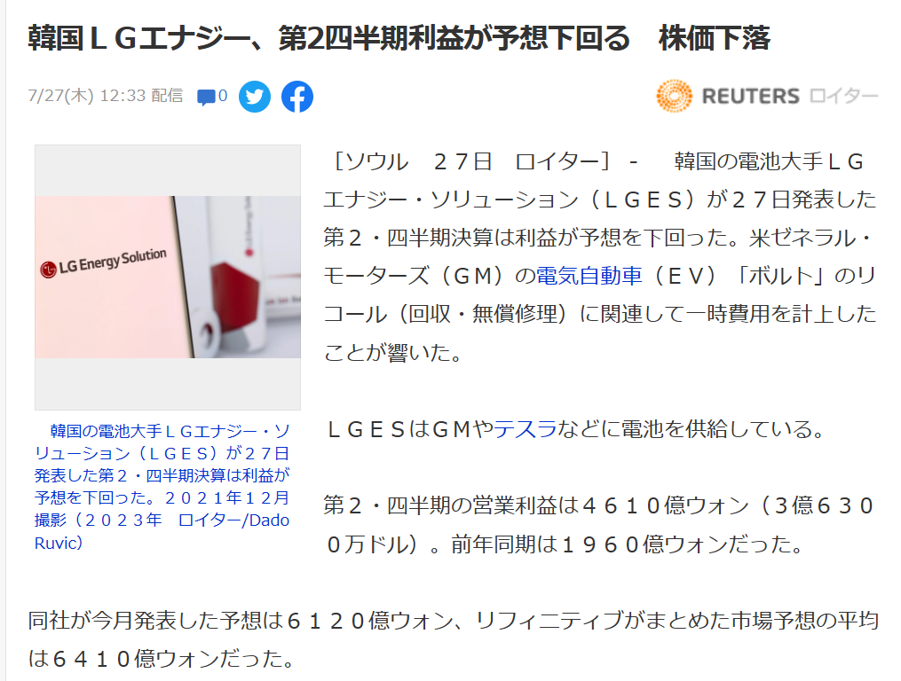 [ソウル 27日 ロイター] - 韓国の電池大手LGエナジー・ソリューション(LGES)が27日発表した第2・四半期決算は利益が予想を下回った。米ゼネラル・モーターズ(GM)の電気自動車(EV)「ボルト」のリコール(回収・無償修理)に関連して一時費用を計上したことが響いた。