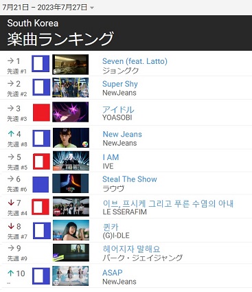 韓国では韓国人だけの曲は、上位10曲中1曲だけ。