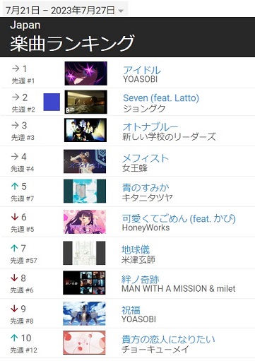 優里 5670万回、Official髭男dism 4980万回、HoneyWorks 3890万回、Ado 3490万回、