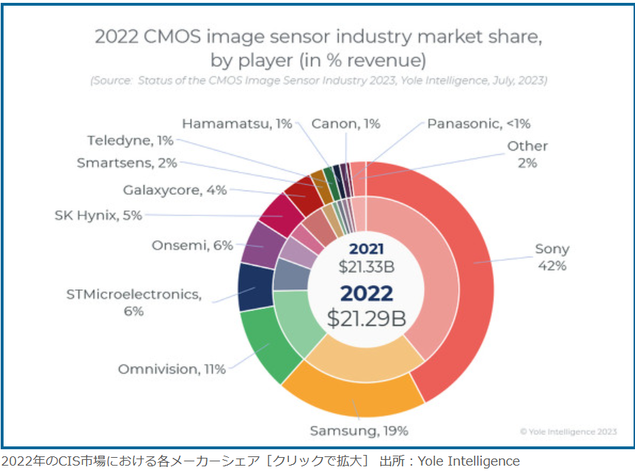 メーカー別でみると、ソニーがシェア42%で首位の座を維持している。Yoleの以前の発表によれば、ソニーは米国の輸出規制に伴うHUAWEI向け出荷減の影響などから2020年、2021年と2年連続でシェアが減少していた。そのため今回、3年ぶりにシェアを拡大した形となっている。