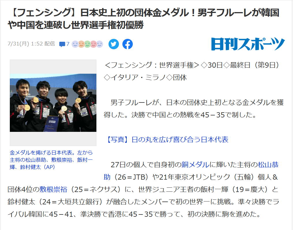 他種目では、男子エペが一昨夏、東京五輪で日本悲願の初の金メダルをつかんだが、世界選手権では昨年の銅メダルが最高だった。個人では15年モスクワ大会で太田が日本男子唯一の優勝を果たし、女子はサーブルの江村美咲(立飛ホールディングス)が今大会、男女を通じて日本勢初の2連覇を遂げた。しかし、団体は全種目で初の制覇。宿願を成就した選手はピスト(競技コート)上で喜びを爆発させ、笑顔で金メダルを掲げた。