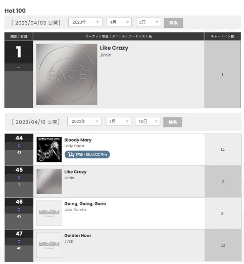 Jimin のこの曲の順位は、1位→45位→52位→82位→97位→圏外