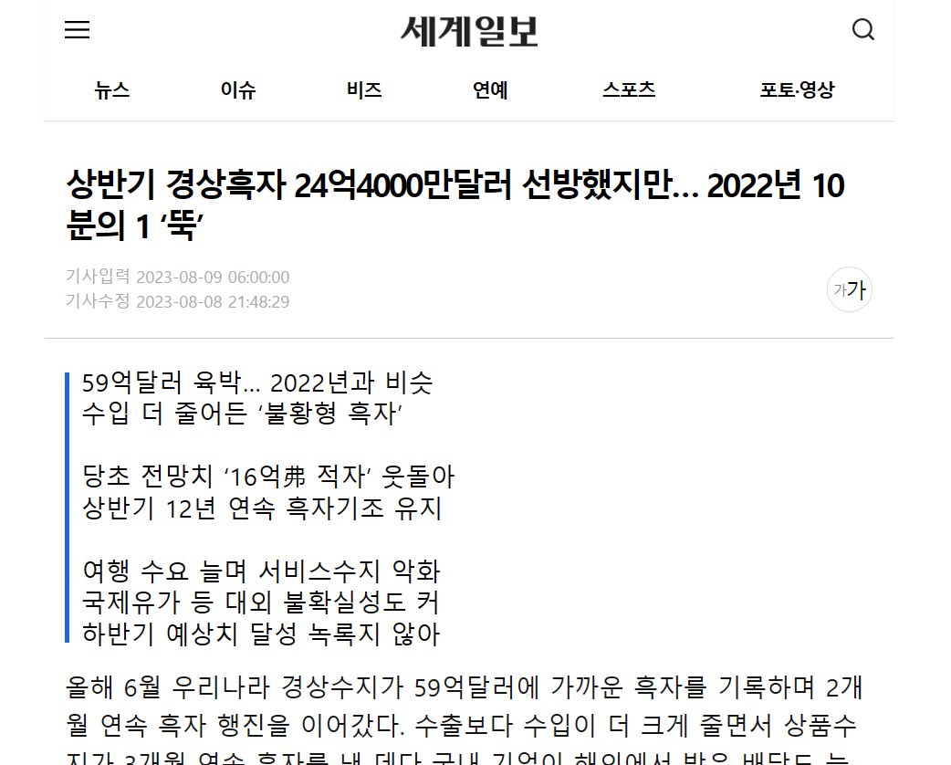しかし、上半期(1~6月)の経常黒字は24億4000万ドルで前年同期(248億7000万ドル)に比べ約90%減少した