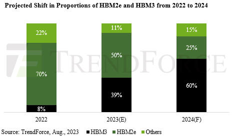 トレンドフォースは2023年にHBM主要需要がHBM2eからHBM3に移動し、予想需要比率がそれぞれ約50%と39%になると見ています。 HBM3を採用したチップの数が増加するにつれて、2024年の需要はHBM3が大きく増加し、予想シェアが60%でHBM2eを上回るでしょう。 HBM3のより高いASPと結合したこのような需要急増は、来年HBM売上の相当な成長を引き起こす可能性があります。