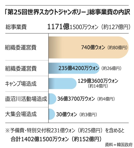 地元全羅北道はジャンボリーを誘致した直後から20兆ウォンを超える予算誘致を主張してきた。全羅北道は2017年、ジャンボリーを円滑に開催するため、▲インフラ▲ユーティリティー施設▲環境施設▲観光施設など34事業に20兆7600億ウォンが必要だと主張。実際に全羅北道がジャンボリーに投じた資金は合計で1402億1500万ウォンだった。