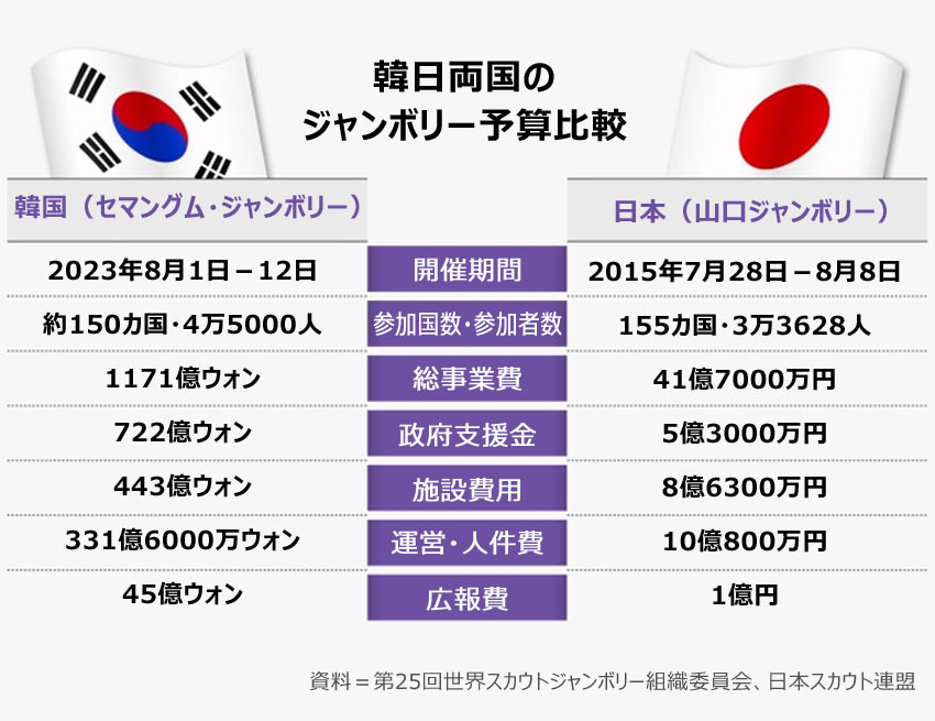 一部では、「今回セマングムで行われたジャンボリーは、8年前に同じ干拓地という条件ながらも開催を成功させた日本の事例と対照的だ」と指摘する声が上がっている。日本は2015年に山口県で韓国(1171億ウォン=約128億7000万円)の3分の1以下の41億7000万円という予算で第23回世界スカウトジャンボリーを開催した。日本のジャンボリーの参加者数は韓国のジャンボリーに比べ25.3%少なかったが、それを考慮しても使用した金額には大きな差がある。