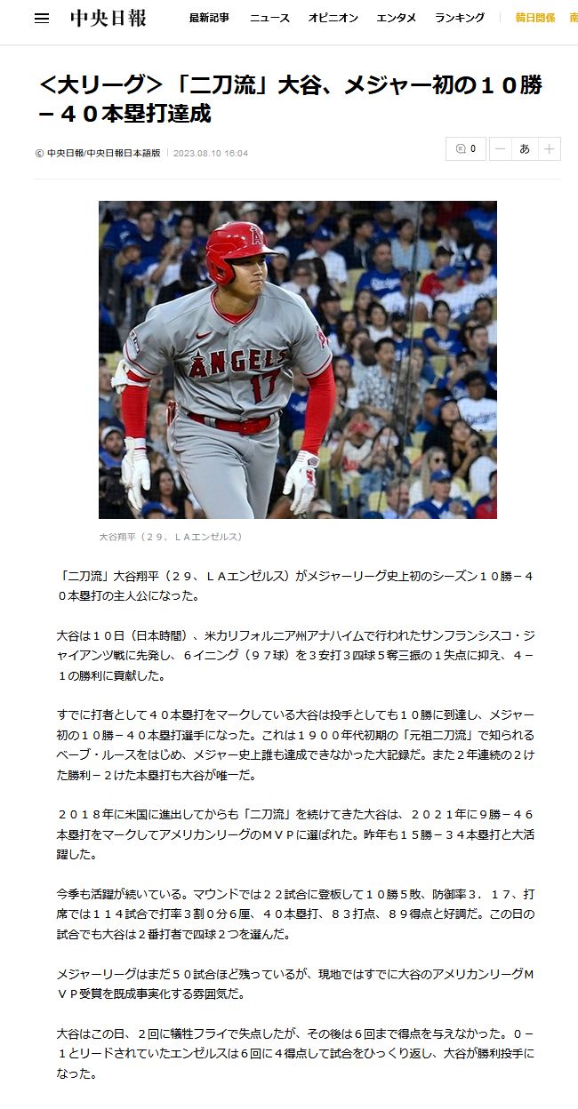 大谷10勝目、2年連続の2桁勝利2桁本塁打 メジャー史上初