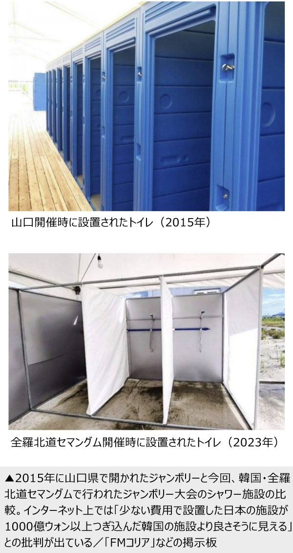 一部では、「今回セマングムで行われたジャンボリーは、8年前に同じ干拓地という条件ながらも開催を成功させた日本の事例と対照的だ」と指摘する声が上がっている。日本は2015年に山口県で韓国(1171億ウォン=約128億7000万円)の3分の1以下の41億7000万円という予算で第23回世界スカウトジャンボリーを開催した。日本のジャンボリーの参加者数は韓国のジャンボリーに比べ25.3%少なかったが、それを考慮しても使用した金額には大きな差がある。