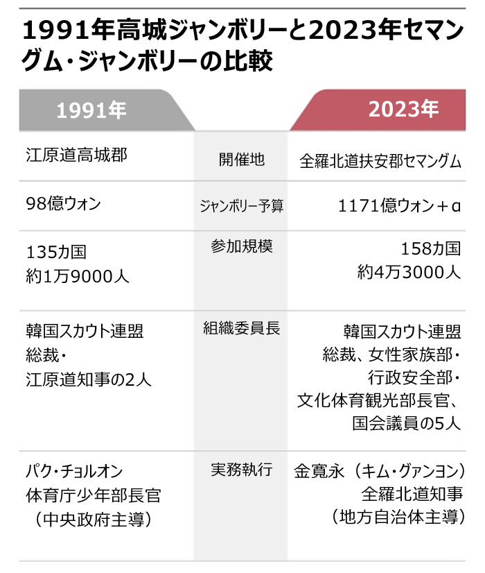 1991年に江原道高城郡で開催された「第17回世界スカウトジャンボリー(以下、高城ジャンボリー)」の予算は98億ウォン(約10億円)、今年、全羅北道扶安郡セマングムで開催された「第25回世界スカウトジャンボリー(以下、セマングム・ジャンボリー)」の予算は1171億ウォン(約127億5000万円)以上だ。