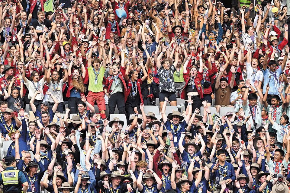 「I just want you call my phone right now…」。アイドルグループのNewJeans(ニュージーンズ)がヒット曲「Hype Boy」のリフレーンを歌い始めると、スカウト団員4万人の合唱がソウルワールドカップ競技場に響いた。