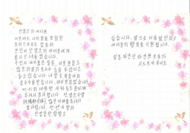 参加者の保護者を名乗る「シノツカ・ユイコ」さんからの手紙は、8月28日に丹陽郡に届いた。辞書を引きながら書いたような韓国語の表現やつづりの間違いも見られる手紙は「私の娘を含むボーイスカウト日本派遣団が丹陽郡の皆さんに大変お世話になりました」と始まっている。
