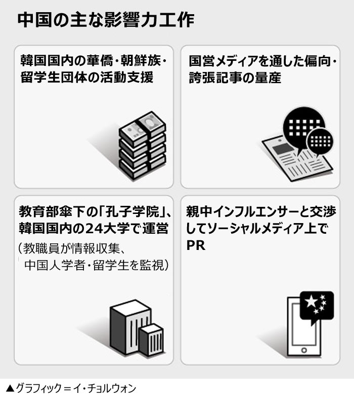 韓国政府の消息筋は7月23日、「中国の工作は外交・親善活動という皮をかぶっているが、真の意図は韓米同盟にひびを入れて韓国の国論分裂をたき付けようというもの」だとした。米中対立が激化し、尹錫悦(ユン・ソンニョル)政権になって韓米日が前例のないほど密着していることから、中国としては韓国を相手にした影響力工作の必要性が高まったのだ。
